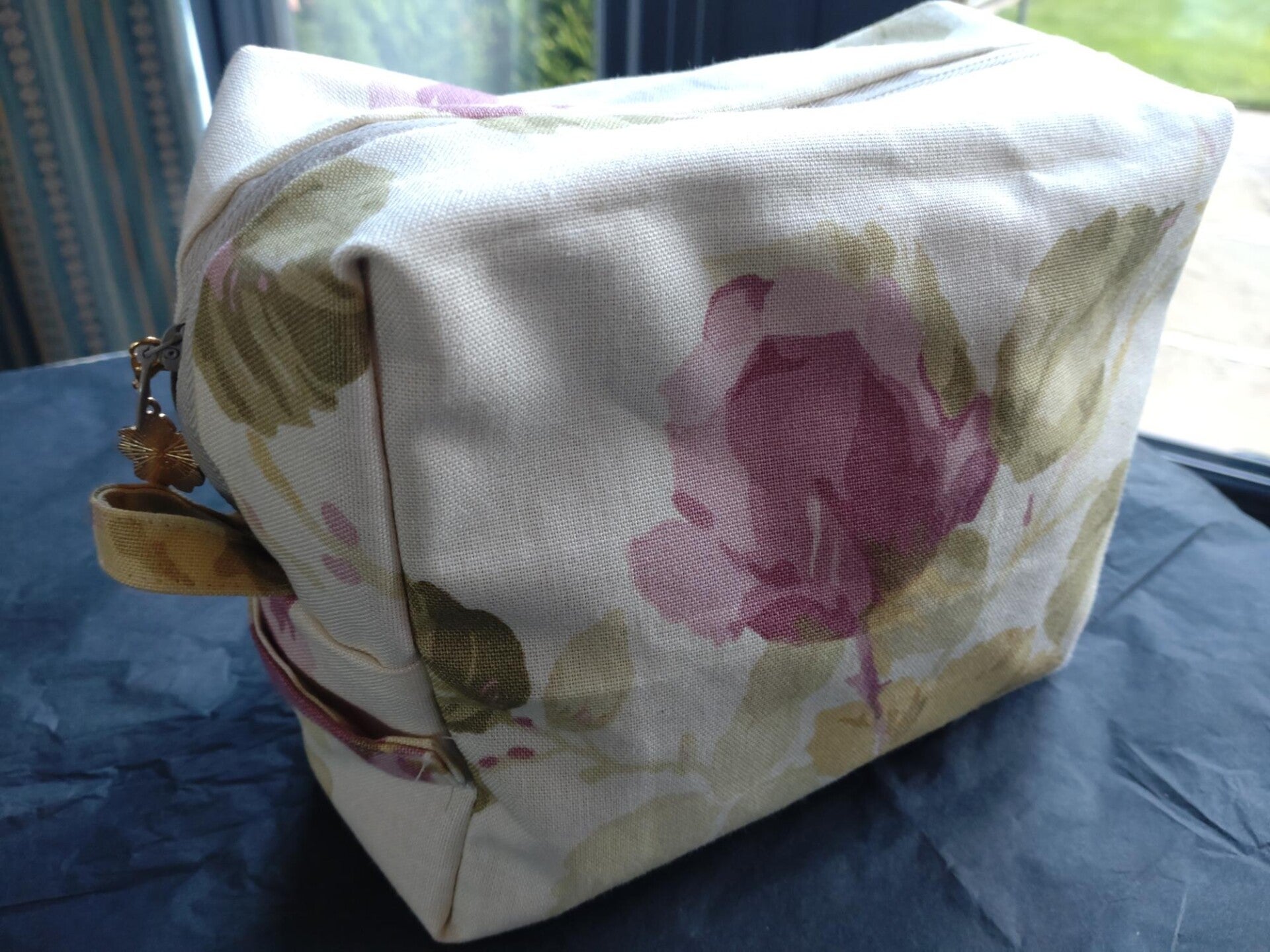 box shaped bag in pretty soft pink/mauve floral print with pink lining