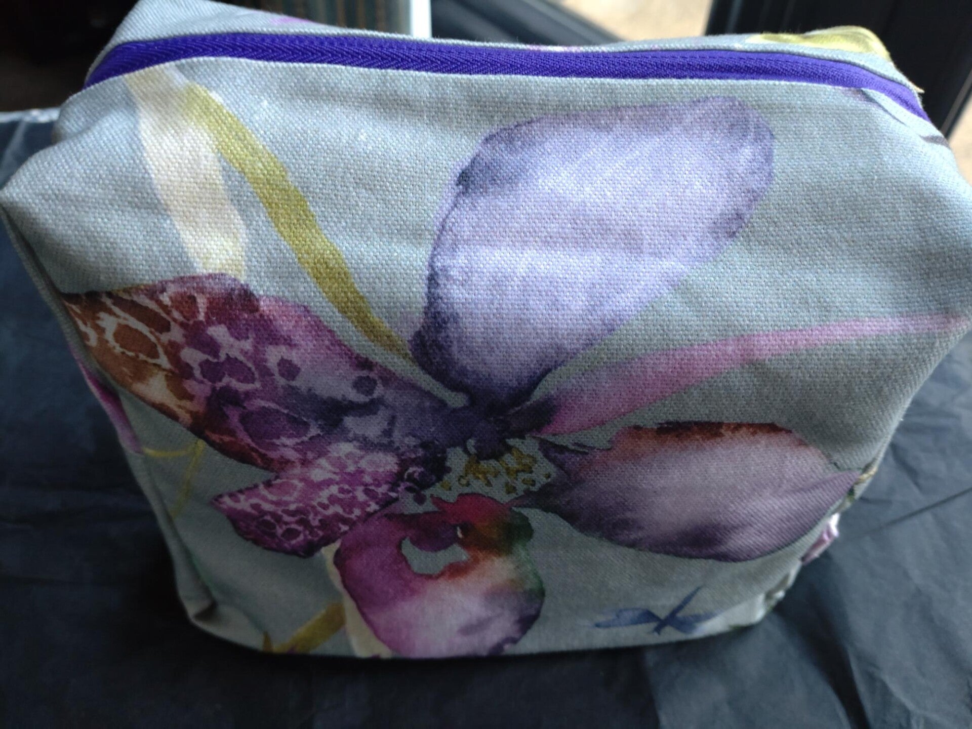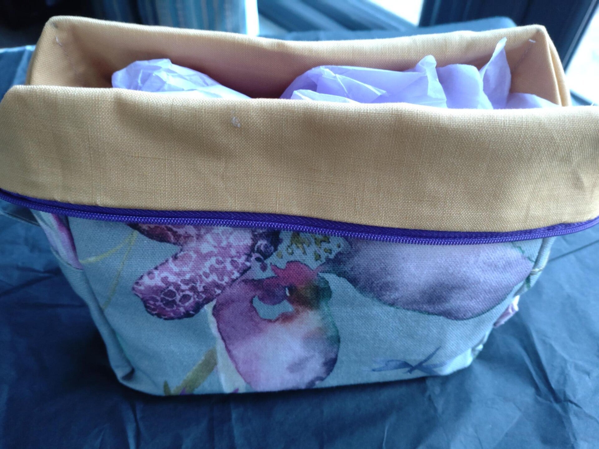 Box bag - pretty fabric with humming bird and flowers - soft grey/mauve colours with a yellow lining